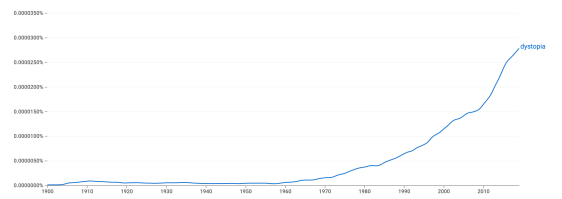 Just dystopier förefaller vara på högsta modet. Detta kan dels illustreras med att själva ordet blivit allt mer frekvent. Den relativa förekomsten av ordet ”dystopi” har ökat kraftigt de senaste decennierna, vilket statistik från Google Books stora korpus visar.